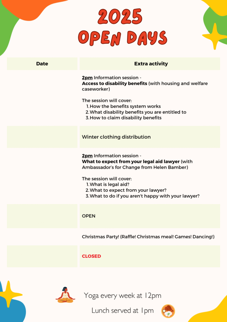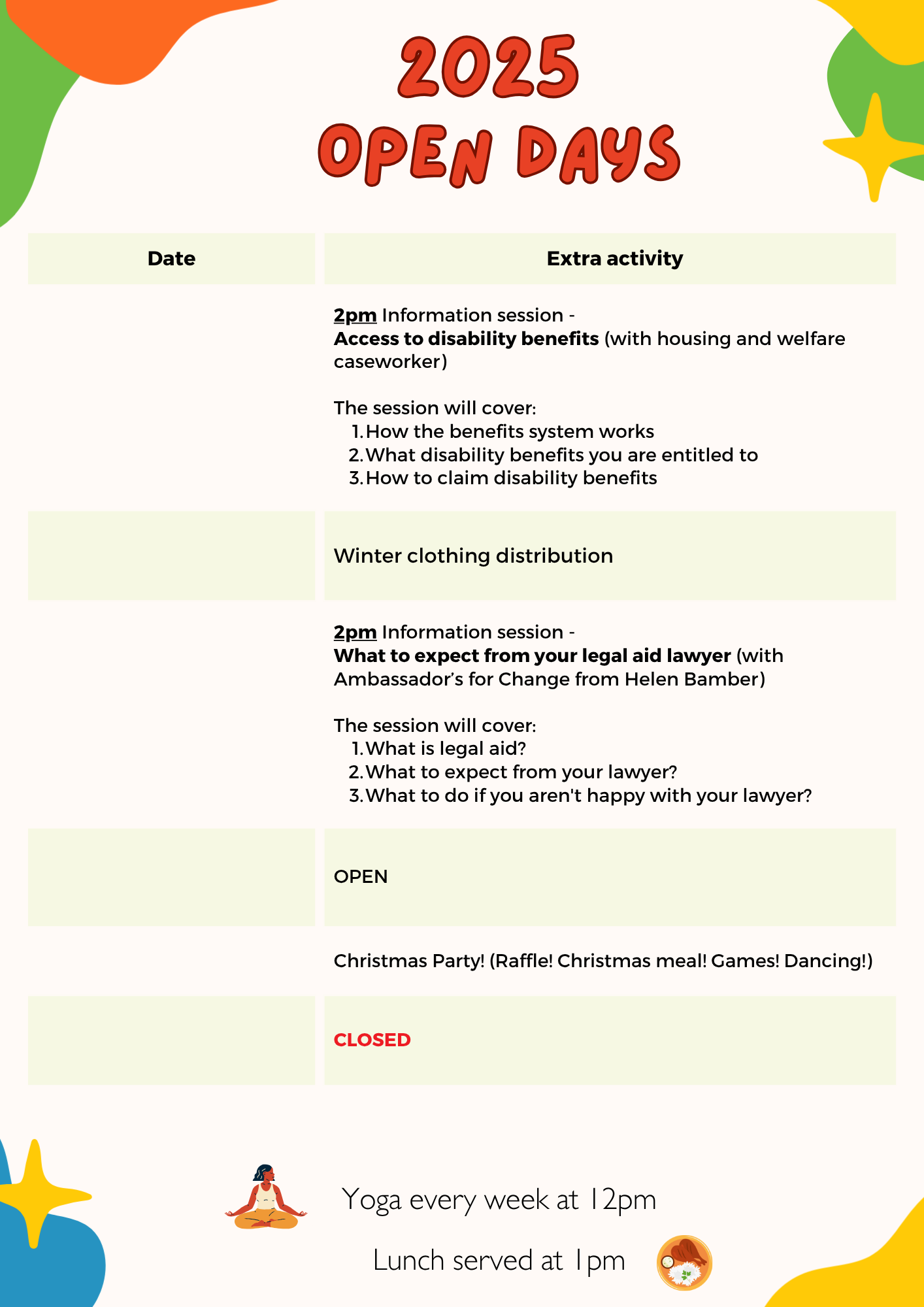 The space is drop-in and free to all. We have a children’s play area, a barber, nail technician, bike mechanic, accessible yoga class, and different craft activities every session. Our chef and team of kitchen volunteers prepare a hot meal with meat and vegan options, to eat in or take-away.